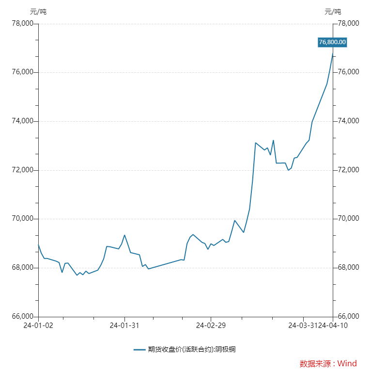 今年以來(lái)銅價(jià)持續(xù)震蕩上行。具體來(lái)看,國(guó)內(nèi)方面,wind數(shù)據(jù)顯示,截至4月10日下午收盤(pán),滬銅主連報(bào)76800元/噸,較上個(gè)交易日上漲0.66%,1月至今,銅價(jià)持續(xù)攀升,較年初上漲7840元/噸,漲幅達(dá)11.4%。國(guó)際方面,截至2024年4月8日收盤(pán),LME銅報(bào)9443美元/噸,國(guó)內(nèi)國(guó)外分別創(chuàng)下近兩年和近一年的價(jià)格新高。