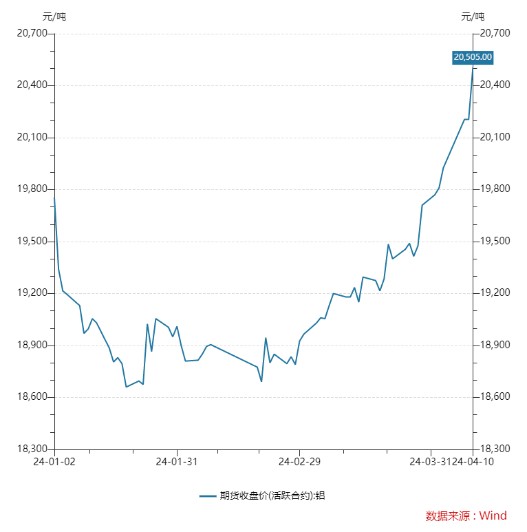 同樣一路“高歌猛進(jìn)”的還有鋁價(jià),截至4月10日下午收盤(pán),滬鋁主連報(bào)20505元/噸,較上個(gè)交易日上漲1.38%,較年初上漲750元/噸,創(chuàng)下自2022年7月以來(lái)的價(jià)格新高。而LME鋁在4月8日收盤(pán)報(bào)2459美元/噸,較前一交易日上漲0.33%。