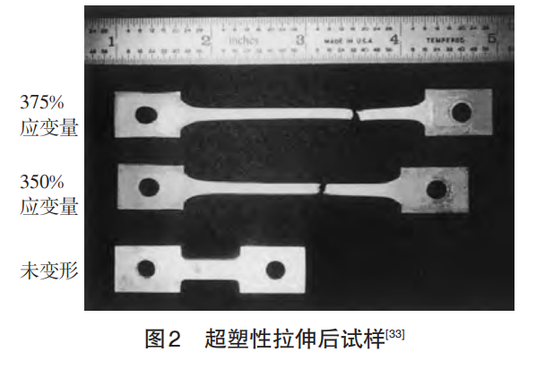TROEGER等對6000系合金的超塑性研究表明,500 ℃以上時合金表現(xiàn)出超塑性。在 540 ℃應(yīng)變速率為2×10-4~5×10-4 /s時,應(yīng)變速率敏感性達(dá)到最大值0.5 /s。應(yīng)變速率為5×10-4 /s時合金的單向拉伸延伸率最大達(dá)375%,對應(yīng)的流變應(yīng)力為4.7 MPa,如圖2所示。周義等用鋁合金以超塑性成形方式進(jìn)行了汽車前擋泥板成形試驗,在成形溫度控制在450~500 ℃、最大脹形壓力達(dá)到0.42 MPa的條件下,試驗取得成功,整個成形時間為 30~60 min。梁繼業(yè)等以 5083 鋁合金為研究對象對車門的鋁合金外板的正反脹超塑性成形工藝進(jìn)行了研究,在480 ℃和應(yīng)變速率為 1×10-3 /s 條件下,最大伸長可達(dá)到242%。雖然超塑性成形時間比一般成形工藝時間長,但在成形時材料塑性流動的阻力非常小,即使是復(fù)雜件也可以一次成形,因而其應(yīng)用前景非常廣泛。