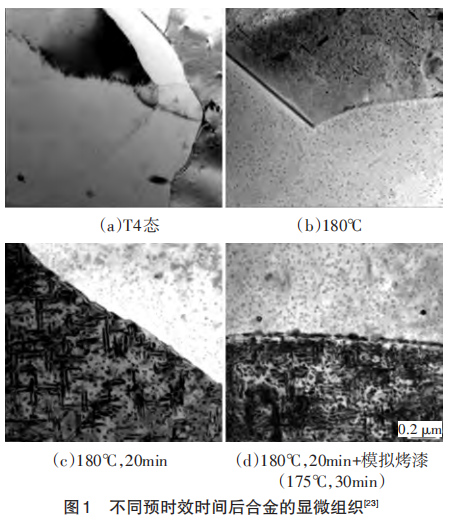 熱處理后鋁合金板材的最終性能受溫度、時間因素的影響。鋁合金退火時,板材的抗拉強度隨退火溫度的升高而降低。淬火時板材的抗拉強度、伸長率隨淬火加熱溫度的升高而增加。進(jìn)行時效熱處理時,隨著時效熱處理保溫時間延長,板材的抗拉強度升高,電導(dǎo)率逐漸增加,但保溫到一定時間時出現(xiàn)峰值后開始下降。熱處理工藝對鋁合金板材的力學(xué)性能和應(yīng)力腐蝕敏感性有影響,2519鋁合金板材經(jīng)先高溫后低溫的雙級時效處理(180 ℃×3 h+145 ℃×24 h)后力學(xué)性能最好,但抗應(yīng)力腐蝕性能最差;經(jīng)形變熱處理(20 ℃×100 h+預(yù)變形15%+145 ℃×21 h)后的力學(xué)性能較好,抗應(yīng)力腐蝕性能最好;過時效狀態(tài)(180 ℃×30 h)下力學(xué)性能最差,抗應(yīng)力腐蝕性能適中。2000 系鋁合金的屈服強度比較高,熱處理進(jìn)行自然時效時其屈服強度進(jìn)一步增加,之后的成形難度增加。在自然時效前,對其進(jìn)行短時間的預(yù)時效,能夠抑制隨后時效過程中 GP 區(qū)的形成,降低自然時效的硬化效果,同時提高合金的應(yīng)變硬化指數(shù)和延伸率,從而提高合金板材的成形性,如圖1所示。6022鋁合金在 500~560 ℃進(jìn)行固溶處理時,晶粒大小基本不變,而第二相數(shù)量顯著減少,超出該溫度范圍后晶粒粗化。560 ℃固溶處理后自然時效可獲得最佳力學(xué)性能。時效前進(jìn)行預(yù)時效,能有效抑制自然時效的不良影響并提高模擬烤漆后的烤漆性能。