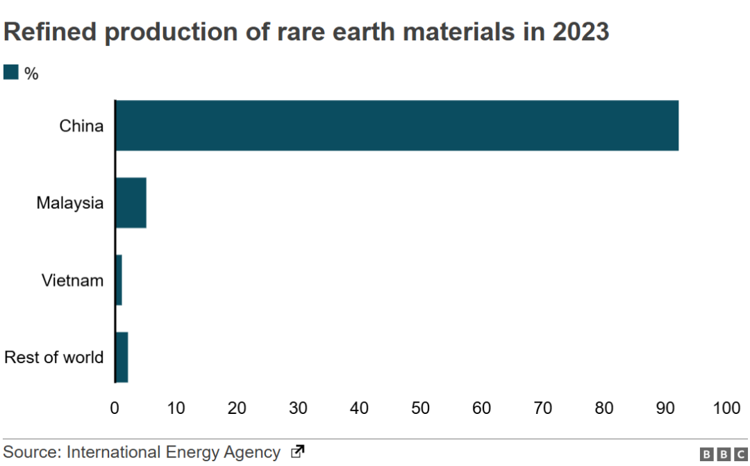 二是技術(shù)先進(jìn)。中國在稀土精煉和高端磁體制造方面掌握核心科技,控制著全球超過90%的稀土精煉產(chǎn)能,高性能釹鐵硼永磁體的生產(chǎn)也由中國主導(dǎo),全球產(chǎn)量超過90%。