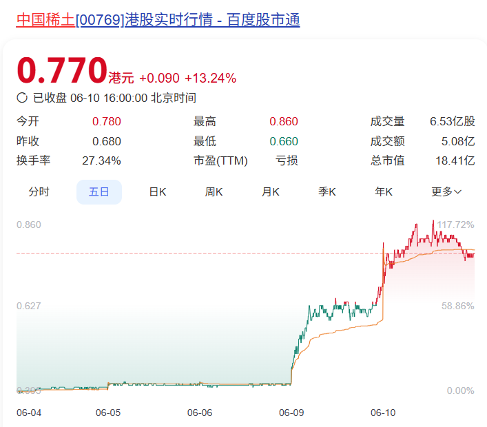更猛的是港股的中國稀土,盤中一度暴漲超50%!