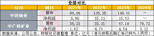 從業(yè)績(jī)方面來看,中國(guó)鈾業(yè)實(shí)力較中廣核礦業(yè)更強(qiáng),2021-2023年中國(guó)鈾業(yè)營(yíng)收分別為89.06億元、105.35億元、148.01億元,凈利潤(rùn)分別為8.96億元、15.21億元、15.53億元;2021-2024年中廣核礦業(yè)營(yíng)收分別為38.60億港元、36.49億港元、73.60億港元、86.24億港元,凈利潤(rùn)分別為1.78億港元、5.15億港元、4.97億港元、3.42億港元。
