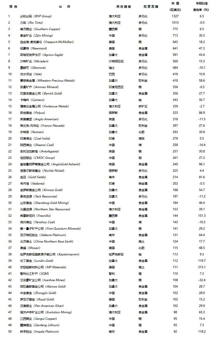 據Mining.com網站梳理統計,截止到二季度末,世界最大50家礦企總市值接近1.5萬億美元,2025年以來已經增長了2130億美元。