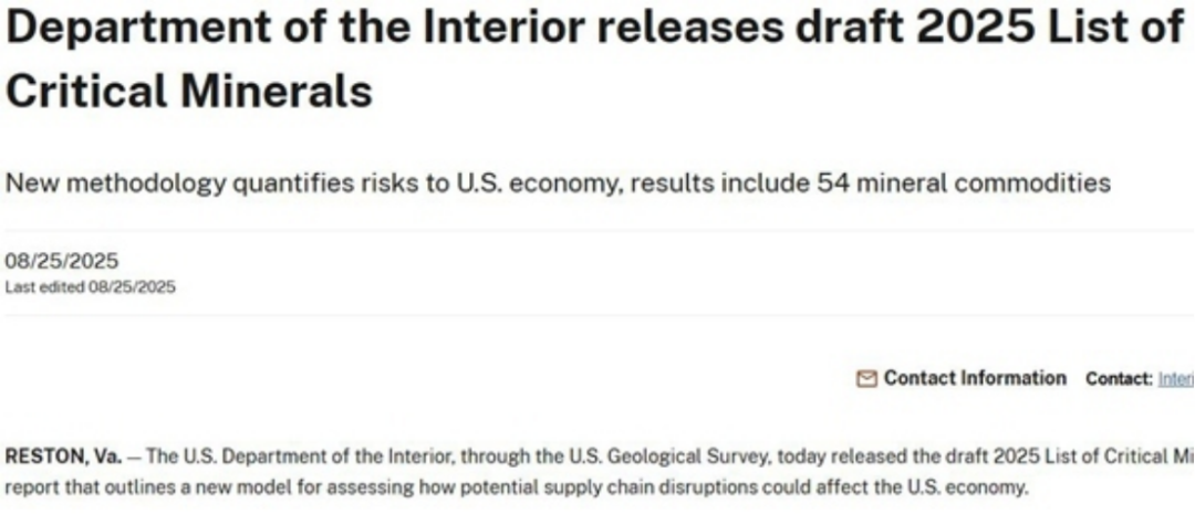 當(dāng)?shù)貢r(shí)間8月25日,美國(guó)地質(zhì)調(diào)查局發(fā)布《2025年關(guān)鍵礦產(chǎn)清單》草案,54種礦產(chǎn)被列入清單。根據(jù)美國(guó)《能源法案》,關(guān)鍵礦產(chǎn)是由美國(guó)地質(zhì)勘探局認(rèn)定的對(duì)美國(guó)經(jīng)濟(jì)和國(guó)家安全至關(guān)重要的礦產(chǎn)或物質(zhì),且相關(guān)礦產(chǎn)是產(chǎn)品制造的基礎(chǔ),但供應(yīng)鏈脆弱。被確定為關(guān)鍵礦產(chǎn)后,相關(guān)礦產(chǎn)的勘探開(kāi)采和處理將享受資金激勵(lì)和更廣泛的支持性政策。