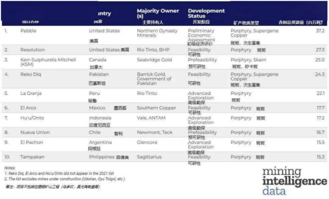 外媒Mining Intelligence根據(jù)三級(jí)(探明、推定和推測(cè))資源量更新了世界十大未開(kāi)發(fā)銅礦項(xiàng)目。前兩的未開(kāi)發(fā)銅礦均位于美國(guó)。