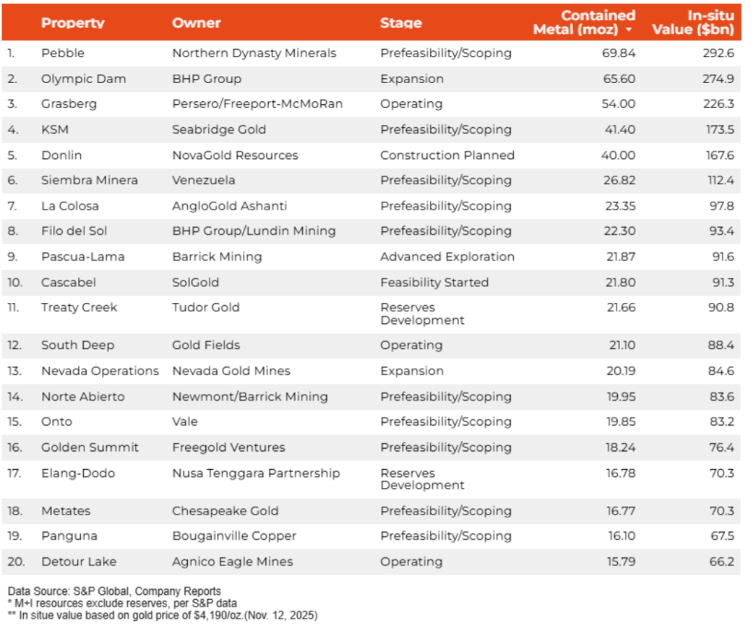 據minging.com統計,排名第一的是北方皇朝礦產公司(NDM)的佩布爾(Pebble)金礦項目,該礦位于美國阿拉斯加州布里斯托灣附近,其中金資源量6984萬盎司,約等于2176.23噸。除了黃金之外,據估算,該礦山預測礦產資源量為2587.8萬噸的銅、154.36萬噸的鉬和3.45億盎司的銀,是世界上資源最豐富的礦床之一。但該項目已經停滯了十多年,當地環保人士、居民和漁業人員堅決反對開發Pebble礦山。