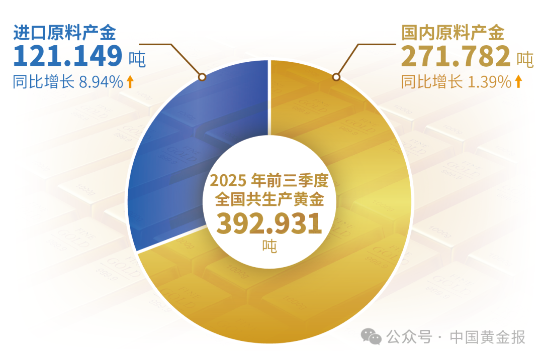 黃金生產(chǎn) 據(jù)中國黃金協(xié)會(huì)最新統(tǒng)計(jì)數(shù)據(jù)顯示:2025年前三季度,國內(nèi)原料產(chǎn)金271.782噸,比2024年同期增加3.714噸,同比增長1.39%。另有進(jìn)口原料產(chǎn)金121.149噸,同比增長8.94%。國內(nèi)原料和進(jìn)口原料共計(jì)生產(chǎn)黃金392.931噸,同比增長3.6%。